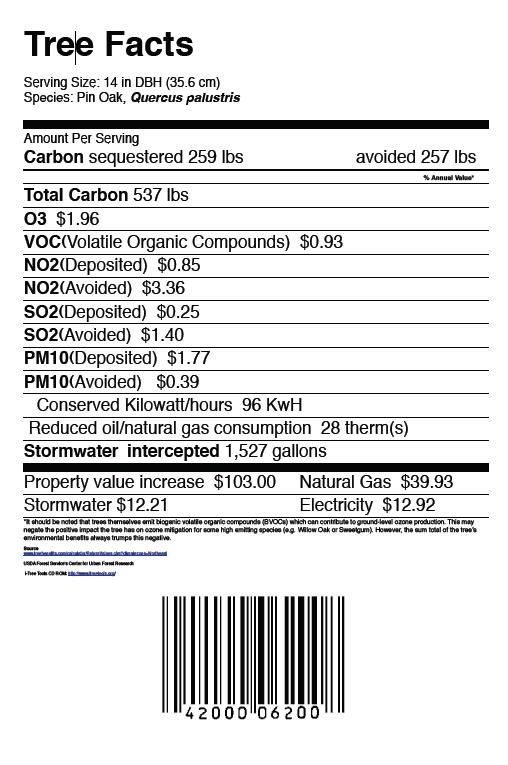 The Nutrition Labels utilize the scientific calculations developed in the i-Tree Streets software tools, and provide a varied summary of the ecosystem services provided by a tree growing in an urban setting. The idea of the project is to provide the general public with information in a creative and attention getting manner. The inclusion of a ‘bar-coded’ scanning identifier on the label helps to get a person’s attention as they pass by the labels which are hung from tree trunks i n conspicuous public locations.